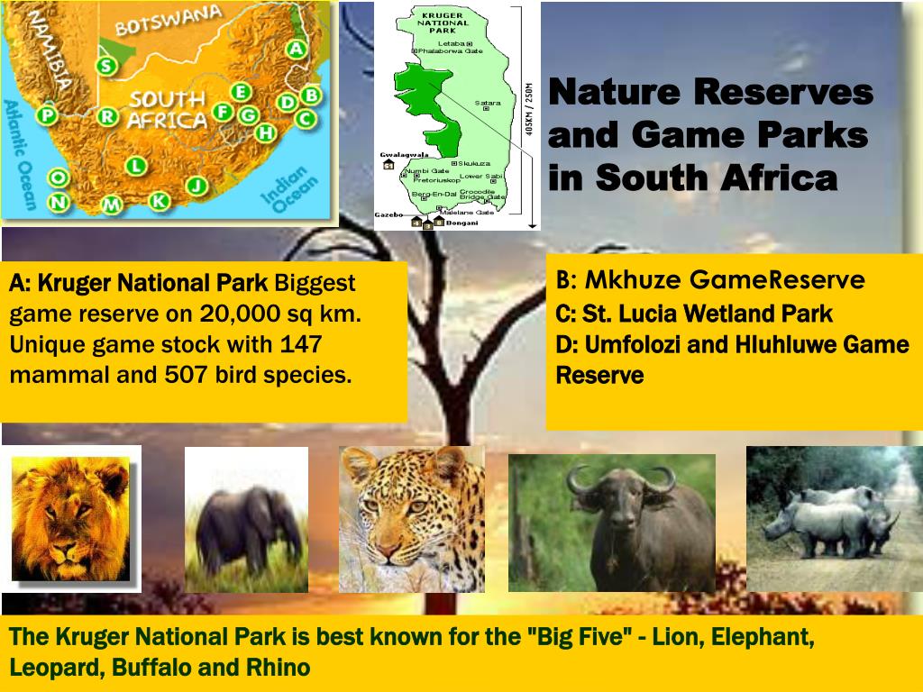 Nature Reservesand Game Parksin South Africa B: Mkhuze GameReserve A: Kruger National Park Biggest game reserve on 20,000 sq km. Unique game stock with 147 mammal and 507 bird species. C: St. Lucia Wetland ParkD: Umfolozi and Hluhluwe Game Reserve The Kruger National Park is best known for the "Big Five" - Lion, Elephant, Leopard, Buffalo and Rhino
