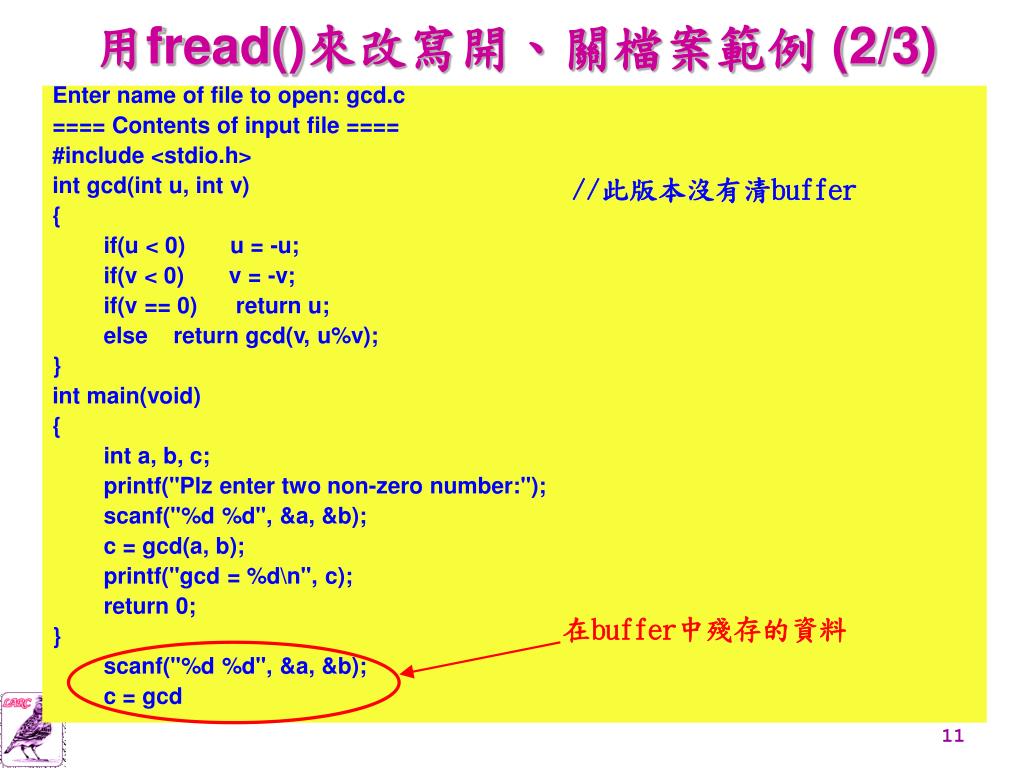 用fread()來改寫開、關檔案範例 (2/3) Enter name of file to open: gcd.c ==== Contents of input file ==== #include <stdio.h> int gcd(int u, int v) { if(u < 0) u = -u; if(v < 0) v = -v; if(v == 0) return u; else return gcd(v, u%v); } int main(void) { int a, b, c; printf("Plz enter two non-zero number:"); scanf("%d %d", &a, &b); c = gcd(a, b); printf("gcd = %d\n", c); return 0; } scanf("%d %d", &a, &b); c = gcd //此版本沒有清buffer 在buffer中殘存的資料