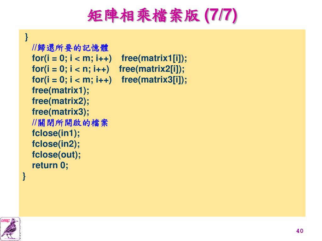 矩陣相乘檔案版 (7/7) } //歸還所要的記憶體 for(i = 0; i < m; i++) free(matrix1[i]); for(i = 0; i < n; i++) free(matrix2[i]); for(i = 0; i < m; i++) free(matrix3[i]); free(matrix1); free(matrix2); free(matrix3); //關閉所開啟的檔案 fclose(in1); fclose(in2); fclose(out); return 0; }