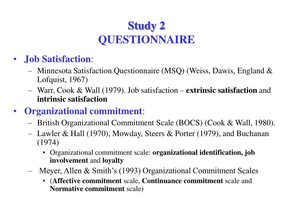 Study 1IMPLICATIONS • Employees job satisfied (extrinsically and intrinsically) > organizationally committed to organization • Human Resource Managers provide organizational environment that employees feel identified