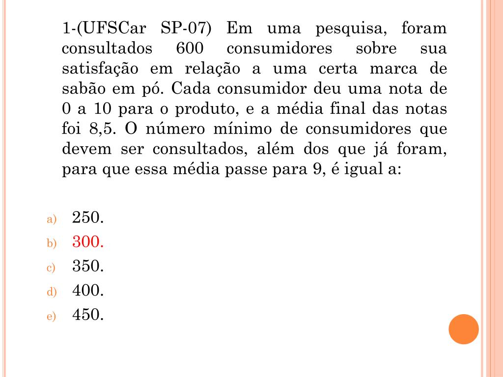 2. 1-(UFSCar SP-07) Em uma pesquisa, foram consultados 600 consumidores sobre sua satisfação em relação a uma certa marca de sabão em pó. Cada consumidor deu uma nota de 0 a 10 para o produto, e a média final das notas foi 8,5. O número mínimo de consumidores que devem ser consultados, além dos que já foram, para que essa média passe para 9, é igual a: • 250. • 300. • 350. • 400. • 450.