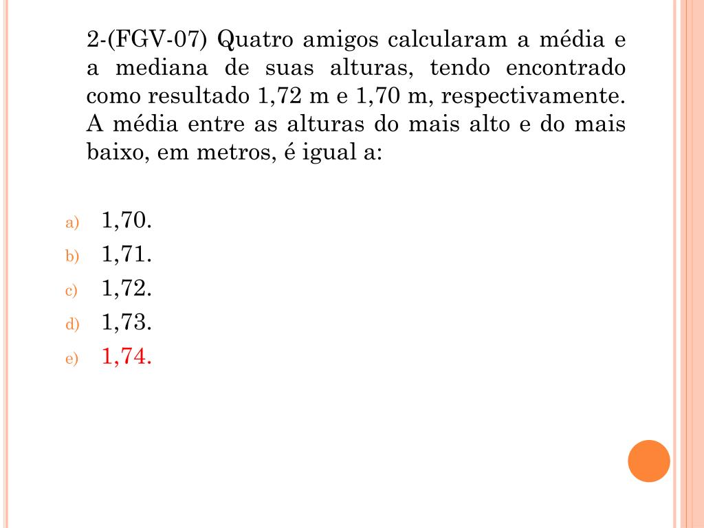 3. 2-(FGV-07) Quatro amigos calcularam a média e a mediana de suas alturas, tendo encontrado como resultado 1,72 m e 1,70 m, respectivamente. A média entre as alturas do mais alto e do mais baixo, em metros, é igual a: • 1,70. • 1,71. • 1,72. • 1,73. • 1,74.