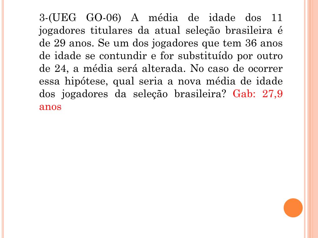 4. 3-(UEG GO-06) A média de idade dos 11 jogadores titulares da atual seleção brasileira é de 29 anos. Se um dos jogadores que tem 36 anos de idade se contundir e for substituído por outro de 24, a média será alterada. No caso de ocorrer essa hipótese, qual seria a nova média de idade dos jogadores da seleção brasileira? Gab: 27,9 anos