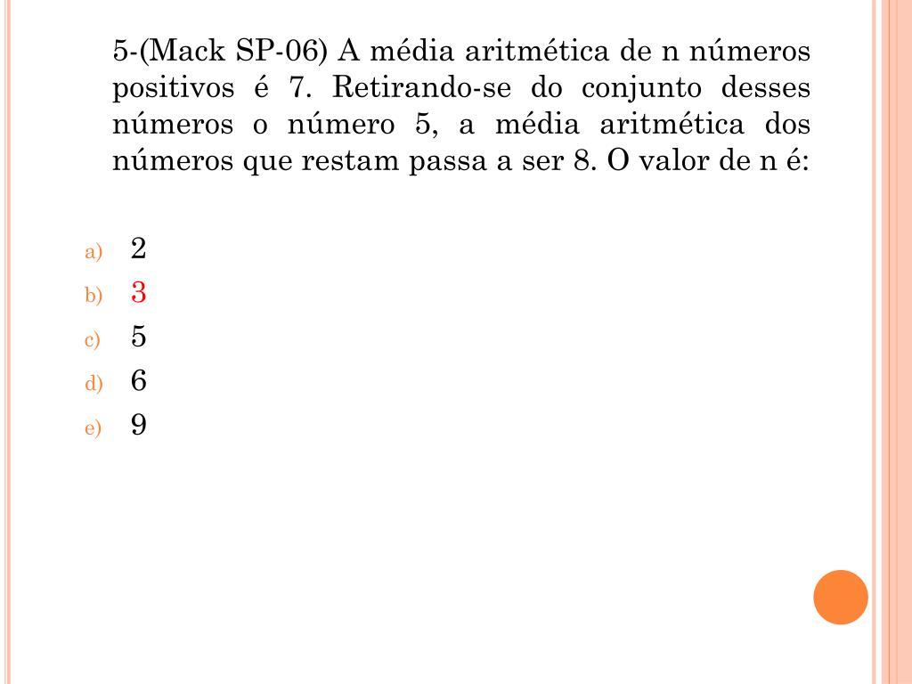 6. 5-(Mack SP-06) A média aritmética de n números positivos é 7. Retirando-se do conjunto desses números o número 5, a média aritmética dos números que restam passa a ser 8. O valor de n é: • 2 • 3 • 5 • 6 • 9