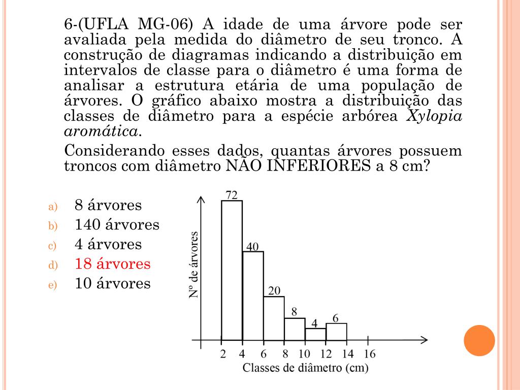 7. 6-(UFLA MG-06) A idade de uma árvore pode ser avaliada pela medida do diâmetro de seu tronco. A construção de diagramas indicando a distribuição em intervalos de classe para o diâmetro é uma forma de analisar a estrutura etária de uma população de árvores. O gráfico abaixo mostra a distribuição das classes de diâmetro para a espécie arbórea Xylopia aromática. Considerando esses dados, quantas árvores possuem troncos com diâmetro NÃO INFERIORES a 8 cm? • 8 árvores • 140 árvores • 4 árvores • 18 árvores • 10 árvores