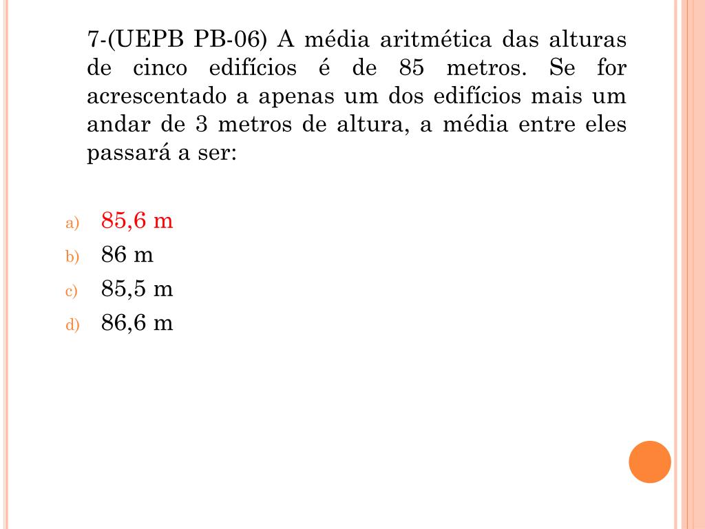 8. 7-(UEPB PB-06) A média aritmética das alturas de cinco edifícios é de 85 metros. Se for acrescentado a apenas um dos edifícios mais um andar de 3 metros de altura, a média entre eles passará a ser: • 85,6 m • 86 m • 85,5 m • 86,6 m