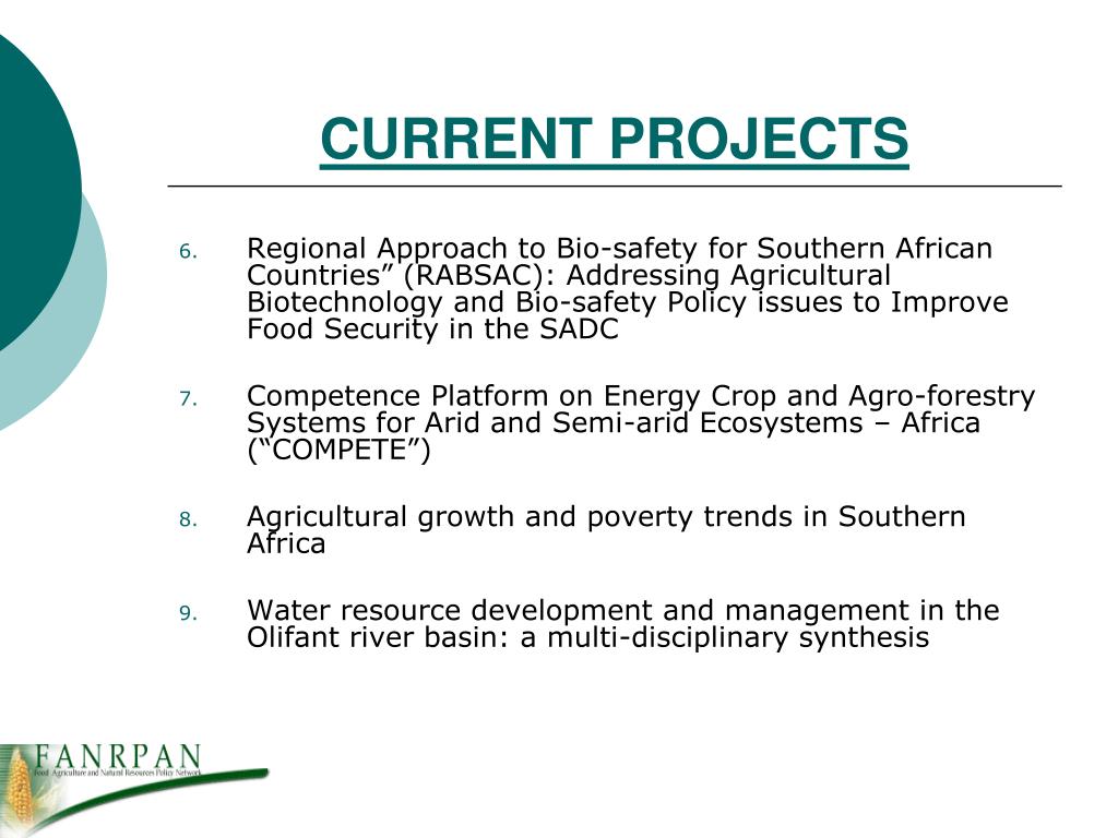 CURRENT PROJECTS • Regional Approach to Bio-safety for Southern African Countries” (RABSAC): Addressing Agricultural Biotechnology and Bio-safety Policy issues to Improve Food Security in the SADC • Competence Platform on Energy Crop and Agro-forestry Systems for Arid and Semi-arid Ecosystems – Africa (“COMPETE”) • Agricultural growth and poverty trends in Southern Africa • Water resource development and management in the Olifant river basin: a multi-disciplinary synthesis