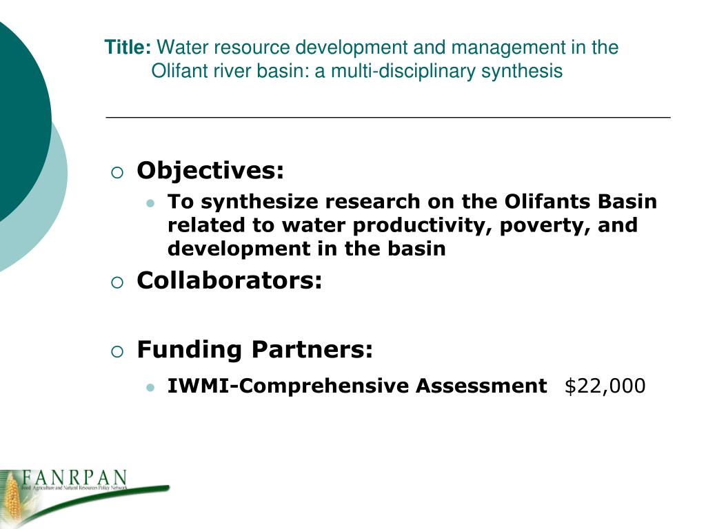 Title: Water resource development and management in the Olifant river basin: a multi-disciplinary synthesis • Objectives: • To synthesize research on the Olifants Basin related to water productivity, poverty, and development in the basin • Collaborators: • Funding Partners: • IWMI-Comprehensive Assessment$22,000