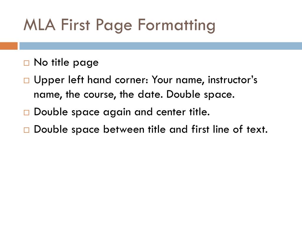 MLA First Page Formatting • No title page • Upper left hand corner: Your name, instructor’s name, the course, the date. Double space. • Double space again and center title. • Double space between title and first line of text.