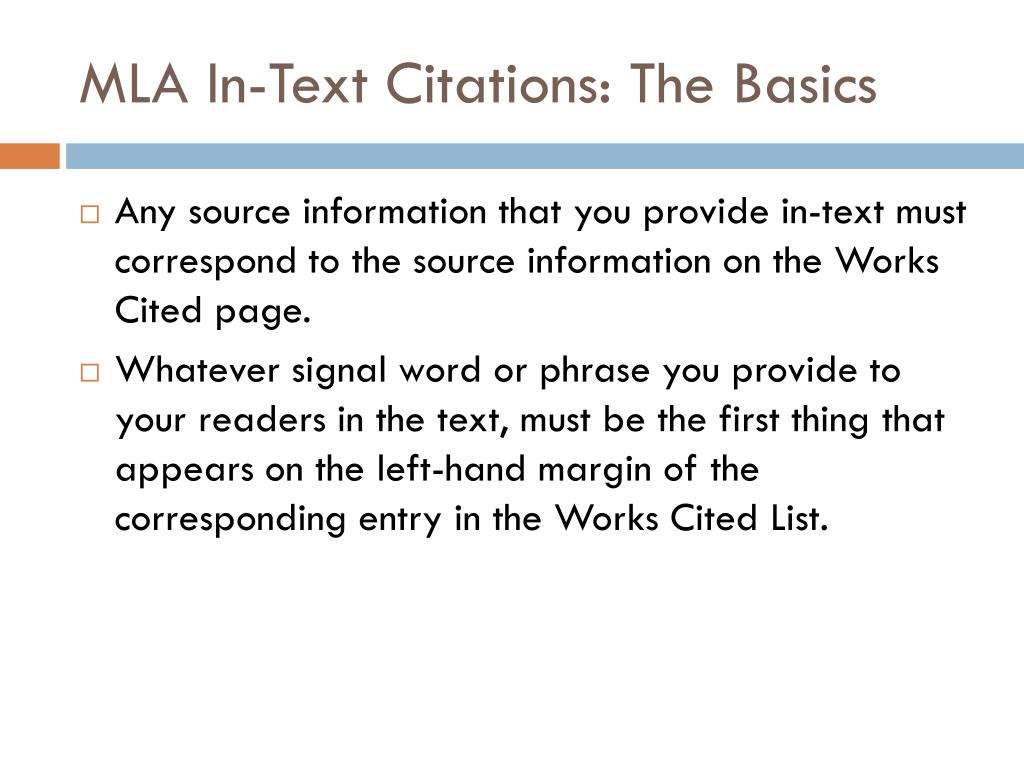 MLA In-Text Citations: The Basics • Any source information that you provide in-text must correspond to the source information on the Works Cited page. • Whatever signal word or phrase you provide to your readers in the text, must be the first thing that appears on the left-hand margin of the corresponding entry in the Works Cited List.