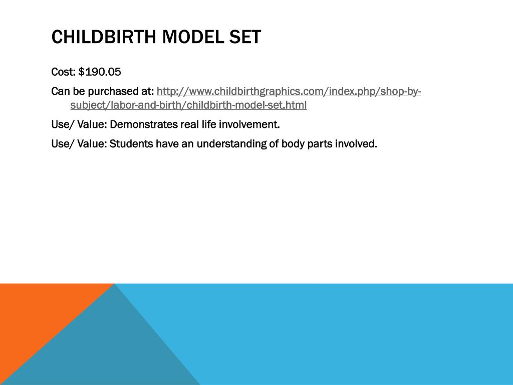 Childbirth Model Set • Cost: $190.05 • Can be purchased at: http://www.childbirthgraphics.com/index.php/shop-by-subject/labor-and-birth/childbirth-model-set.html • Use/ Value: Demonstrates real life involvement. • Use/ Value: Students have an understanding of body parts involved.