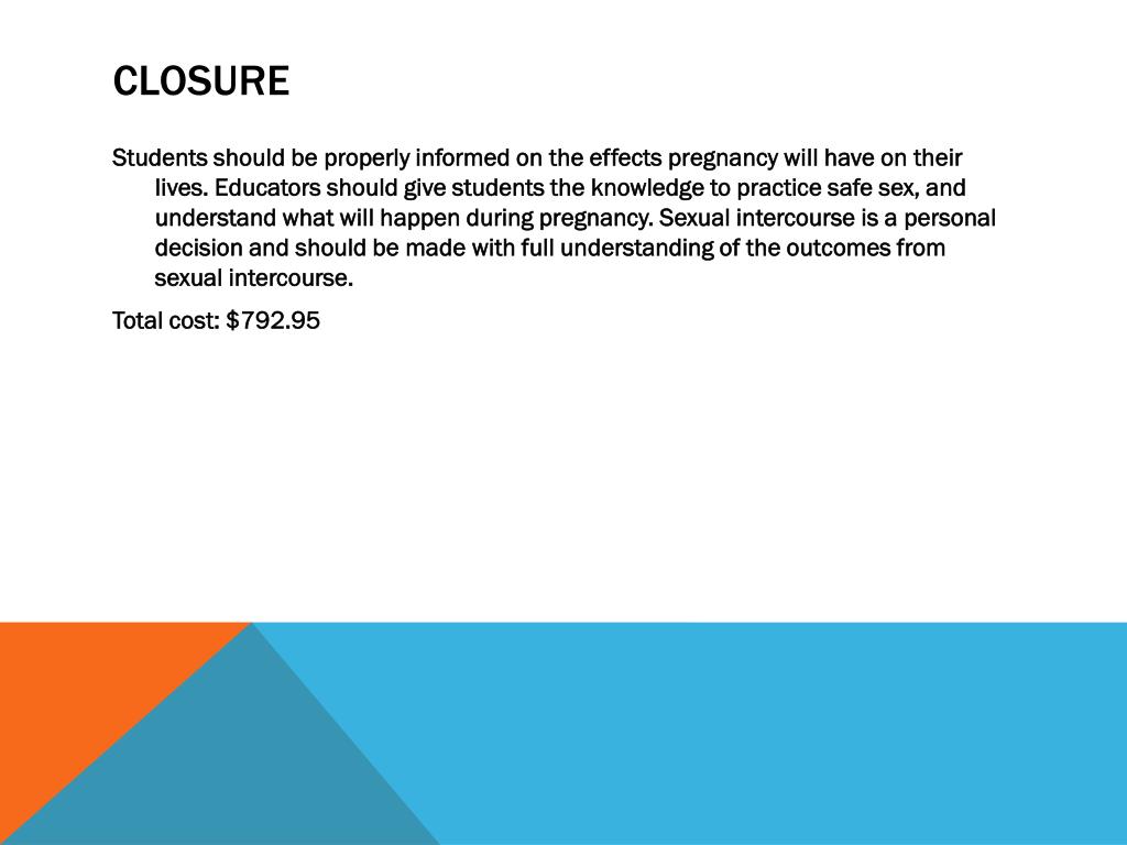 Closure • Students should be properly informed on the effects pregnancy will have on their lives. Educators should give students the knowledge to practice safe sex, and understand what will happen during pregnancy. Sexual intercourse is a personal decision and should be made with full understanding of the outcomes from sexual intercourse. • Total cost: $792.95