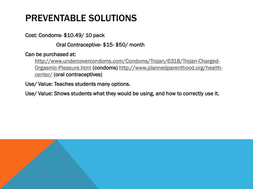Preventable Solutions • Cost: Condoms- $10.49/ 10 pack Oral Contraceptive- $15- $50/ month • Can be purchased at: http://www.undercovercondoms.com/Condoms/Trojan/6318/Trojan-Charged-Orgasmic-Pleasure.html (condoms) http://www.plannedparenthood.org/health-center/ (oral contraceptives) • Use/ Value: Teaches students many options. • Use/ Value: Shows students what they would be using, and how to correctly use it.