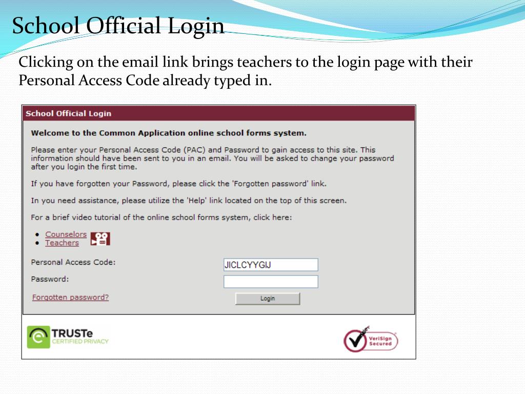 School Official Login Clicking on the email link brings teachers to the login page with their Personal Access Code already typed in.