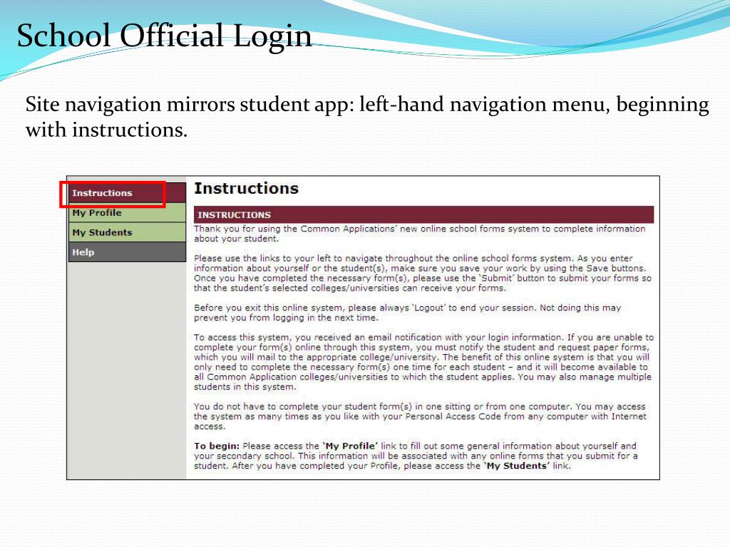 School Official Login Site navigation mirrors student app: left-hand navigation menu, beginning with instructions.
