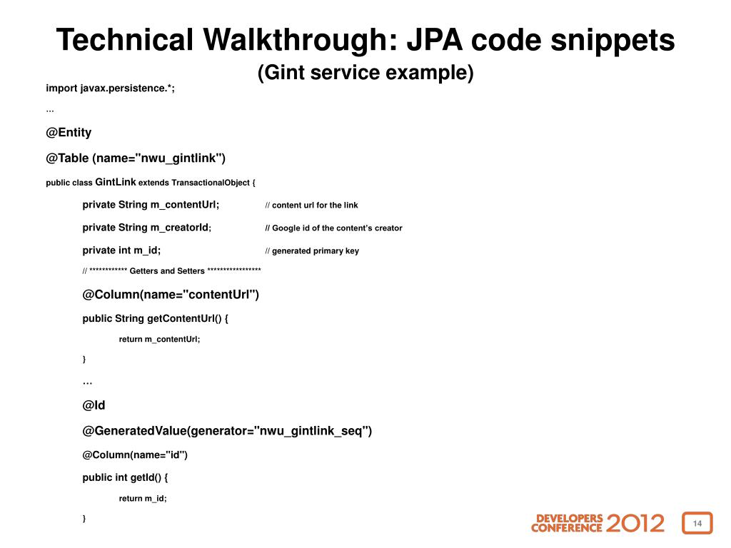 Technical Walkthrough: JPA code snippets(Gint service example) import javax.persistence.*; … @Entity @Table (name="nwu_gintlink") public class GintLink extends TransactionalObject { private String m_contentUrl; // content url for the link private String m_creatorId; // Google id of the content’s creator private intm_id; // generated primary key // ************ Getters and Setters ***************** @Column(name="contentUrl") public String getContentUrl() { return m_contentUrl; } … @Id @GeneratedValue(generator="nwu_gintlink_seq") @Column(name="id") public intgetId() { return m_id; }
