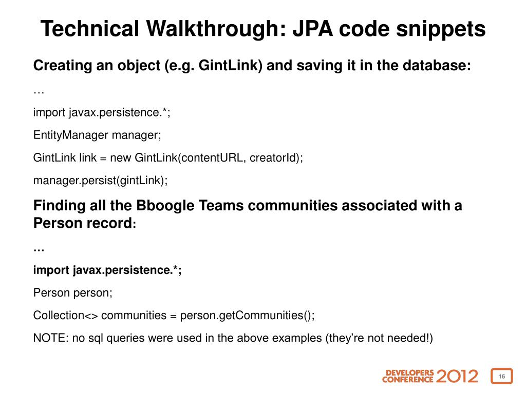Technical Walkthrough: JPA code snippets Creating an object (e.g. GintLink) and saving it in the database: … import javax.persistence.*; EntityManager manager; GintLink link = new GintLink(contentURL, creatorId); manager.persist(gintLink); Finding all the Bboogle Teams communities associated with a Person record: … import javax.persistence.*; Person person; Collection<> communities = person.getCommunities(); NOTE: no sql queries were used in the above examples (they’re not needed!)