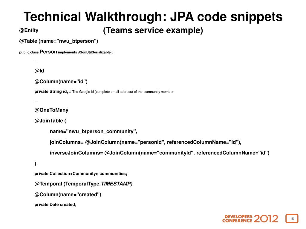Technical Walkthrough: JPA code snippets(Teams service example) @Entity @Table (name="nwu_btperson") public class Person implements JSonUtilSerializable{ … @Id @Column(name="id") private String id; // The Google id (complete email address) of the community member … @OneToMany @JoinTable ( name="nwu_btperson_community", joinColumns= @JoinColumn(name="personId", referencedColumnName="id"), inverseJoinColumns= @JoinColumn(name="communityId", referencedColumnName="id") ) private Collection<Community> communities; @Temporal (TemporalType.TIMESTAMP) @Column(name="created") private Date created;