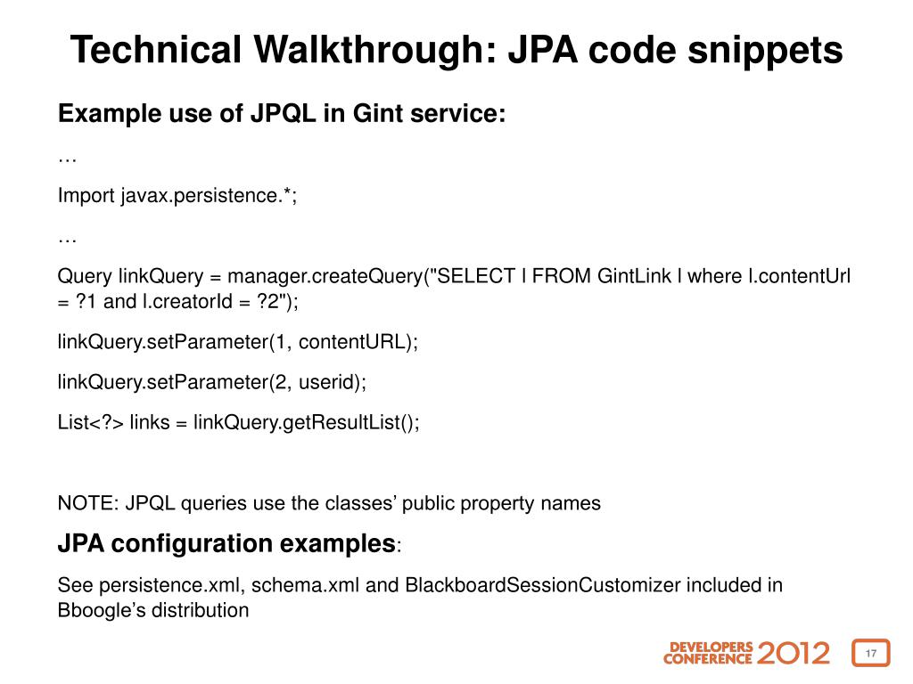 Technical Walkthrough: JPA code snippets Example use of JPQL in Gint service: … Import javax.persistence.*; … Query linkQuery = manager.createQuery("SELECT l FROM GintLink l where l.contentUrl = ?1 and l.creatorId = ?2"); linkQuery.setParameter(1, contentURL); linkQuery.setParameter(2, userid); List<?> links = linkQuery.getResultList(); NOTE: JPQL queries use the classes’ public property names JPA configuration examples: See persistence.xml, schema.xml and BlackboardSessionCustomizer included in Bboogle’s distribution