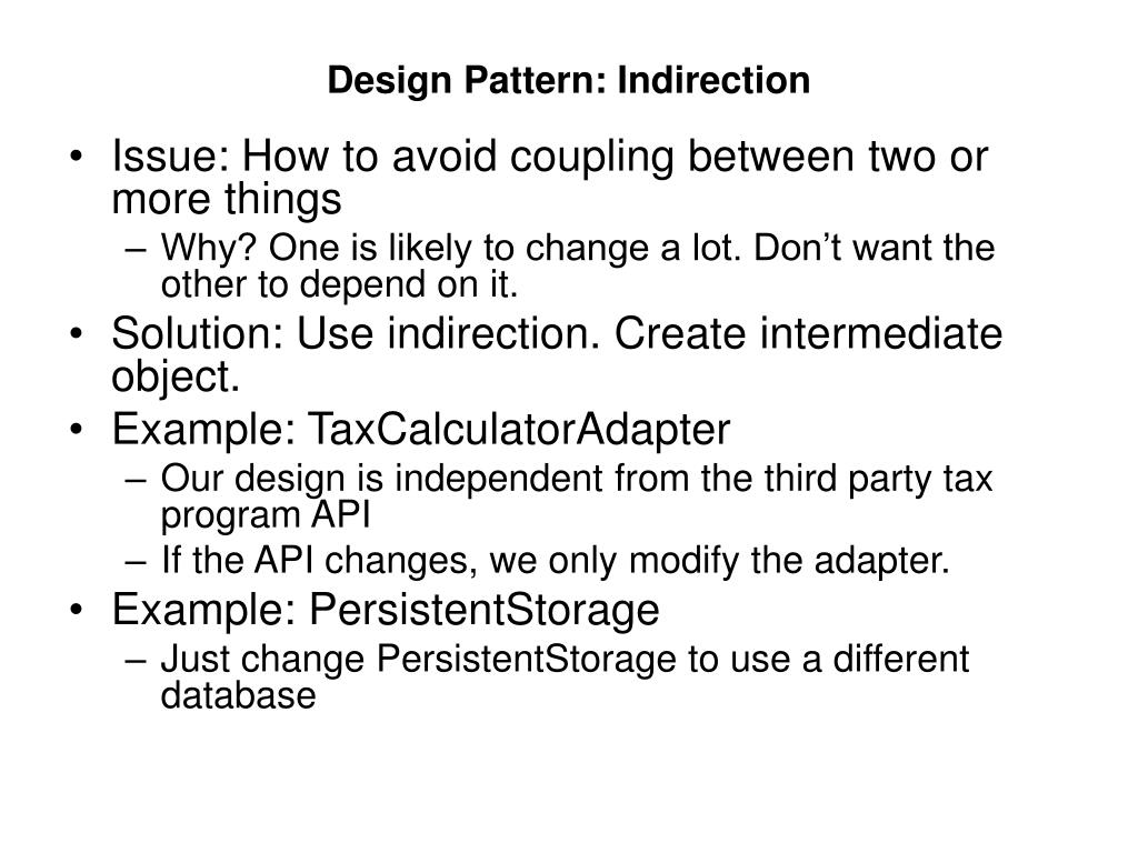 Design Pattern: Indirection • Issue: How to avoid coupling between two or more things • Why? One is likely to change a lot. Don’t want the other to depend on it. • Solution: Use indirection. Create intermediate object. • Example: TaxCalculatorAdapter • Our design is independent from the third party tax program API • If the API changes, we only modify the adapter. • Example: PersistentStorage • Just change PersistentStorage to use a different database
