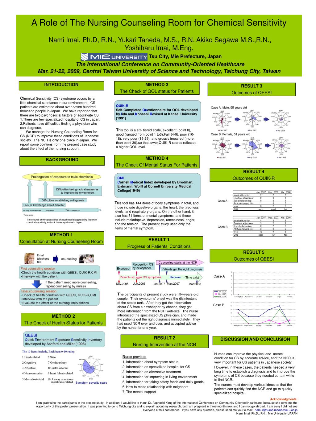 Counseling starts at the NCR Recognition CS by newspaper Exposure Patients get the right diagnosis (Time axis) Patients struggle CS symptoms Recover Jun.2006 May.2007 Nov.2005 Jan.2007 Mar.2008 Tsu City, Mie Prefecture, Japan A Role of The Nursing Counseling Room for Chemical Sensitivity Nami Imai, Ph.D, R.N., Yukari Taneda, M.S., R.N. Akiko Segawa M.S.,R.N., Yoshiharu Imai, M.Eng.The International Conference on Community-Oriented HealthcareMar. 21-22, 2009, Central Taiwan University of Science and Technology, Taichung City, Taiwan INTRODUCTION METHOD 3 The Check of QOL status for Patients RESULT 3 Outcomes of QEESI Chemical Sensitivity (CS) syndrome occurs by a little chemical substance in our environment. CS patients are estimated about over seven hundred thousand people in Japan. We have reported that there are two psychosocial factors of aggravate CS. 1.There are few specialized hospital of CS in Japan. 2.Patients have difficulties finding a physician who can diagnose. We manage the Nursing Counseling Room for CS (NCR) to improve these conditions of Japanese society. The NCR is only one place in Japan. We report some opinions from the present case study about the effect of the nursing support. QUIK-R Self-Completed Questionnaire for QOL developed by Iida and Kohashi Revised at Kansai University (1991) This tool is a six- tiered scale, excellent (point 0), good (ranged from point 1 to3),Fair (4-9), poor (10-18), very poor (19-29), and grossly impaired (more than point 30),so that lower QUIK-R scores reflected a higher QOL level. METHOD 4 The Check Of Mental Status For Patients BACKGROUND RESULT 4 Outcomes of QUIK-R CMI Cornell Medical Index developed by Brodman, Erdmann, Wolff at Cornell University Medical College(1949) Case A This tool has 144 items of body symptoms in total, and those include digestive organs, the heart, the tiredness levels, and respiratory organs. On the other hand, it also has 51 items of mental symptoms, and those include maladaptive, depression, uneasiness, anger, and the tension. The present study used only the items of mental symptom. Case B METHOD 1 Consultation at Nursing Counseling Room RESULT 1 Progress of Patients’ Conditions RESULT 5 Outcomes of QEESI Case A The participants of present study were fifty-years-old couple. Their symptoms’ onset was the disinfectant of the septic tank. After they got the information about CS from a newspaper by chance, they got more information from the NCR web-site. The nurse introduced the specialized CS physician, and made the patients get the right diagnosis immediately. They had used NCR over and over, and accepted advice by the nurse for one year. Case B METHOD 2 The Check of Health Status for Patients RESULT 2 Nursing Intervention at the NCR DISCUSSION AND CONCLUSION Nurses can improve the physical and mental condition for CS by accurate advice, and the NCR is very important for CS patients in Japanese society. However, in these cases, the patients needed a very long time to establish a diagnosis and to improve the symptoms of CS because they needed certain while to find NCR. The nurses must develop various ideas so that the patients can quickly find the NCR and go to quickly specialized hospital. • Nurse provided • Information about symptom status • Information on specialized hospital for CS • Information on alternative treatment • Information for improving in living environment • Information for taking safety foods and daily goods • How to make relationship with neighbors • The mental support Acknowledgments:I am grateful to the participants in the present study. In addition, I would like to thank Dr. Asphodel Yang of the International Conference on Community-Oriented Healthcare, because she gave me the opportunity of this poster presentation. I was planning to go to Taichung city and to explain about my research, but I am pregnant in three month now, and I can not go abroad. I am sorry I did not see everyone at this conference. If you have any question, please send me your e-mail: nami-i@nurse.medic.mie-u.ac.jp Nami Imai, Ph.D., RN. , Mie University, JAPAN This tool is a six- tiered scale, excellent (point 0), good (ranged from point 1 to3),Fair (4-9), poor (10-18), very poor (19-29), and grossly impaired (more than point 30),so that lower QUIK-R scores reflected a higher QOL level.