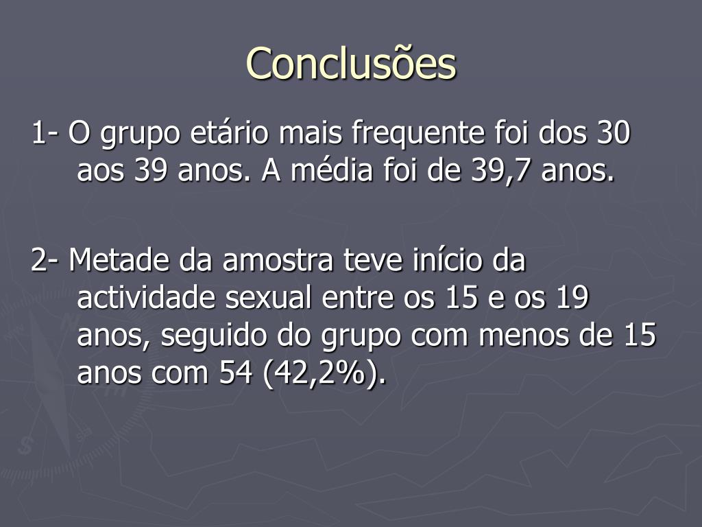 Conclusões 1- O grupo etário mais frequente foi dos 30 aos 39 anos. A média foi de 39,7 anos. 2- Metade da amostra teve início da actividade sexual entre os 15 e os 19 anos, seguido do grupo com menos de 15 anos com 54 (42,2%).