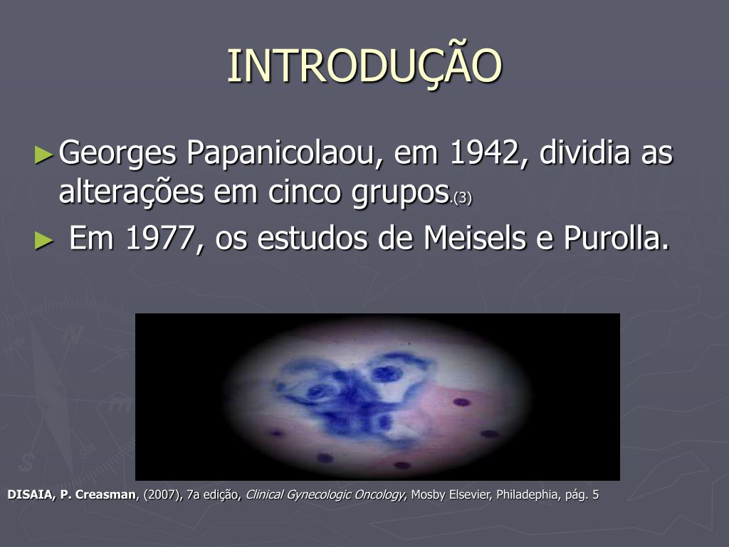 INTRODUÇÃO • Georges Papanicolaou, em 1942, dividia as alterações em cinco grupos.(3) • Em 1977, os estudos de Meisels e Purolla. DISAIA,P. Creasman, (2007), 7a edição, Clinical Gynecologic Oncology, Mosby Elsevier, Philadephia, pág. 5