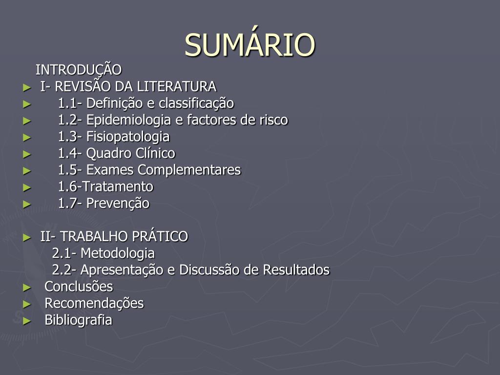 SUMÁRIO INTRODUÇÃO • I- REVISÃO DA LITERATURA • 1.1- Definição e classificação • 1.2- Epidemiologia e factores de risco • 1.3- Fisiopatologia • 1.4- Quadro Clínico • 1.5- Exames Complementares • 1.6-Tratamento • 1.7- Prevenção • II- TRABALHO PRÁTICO 2.1- Metodologia 2.2- Apresentação e Discussão de Resultados • Conclusões • Recomendações • Bibliografia