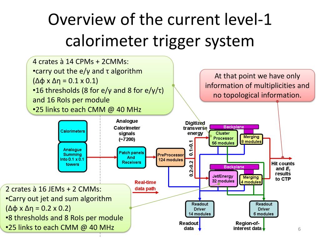 Overview of thecurrent level-1 calorimetertriggersystem • 4 crates à 14 CPMs + 2CMMs: • carry out the e/γ and τ algorithm(Δφ x Δη = 0.1 x 0.1) • 16 thresholds (8 for e/γ and 8 for e/γ/τ) and 16 RoIs per module • 25 links to each CMM @ 40 MHz At that point wehaveonlyinformation of multiplicities and no topologicalinformation. • 2 crates à 16 JEMs + 2 CMMs: • Carry out jet and sumalgorithm (Δφ x Δη = 0.2 x 0.2) • 8 thresholds and 8 RoIs per module • 25 links to each CMM @ 40 MHz