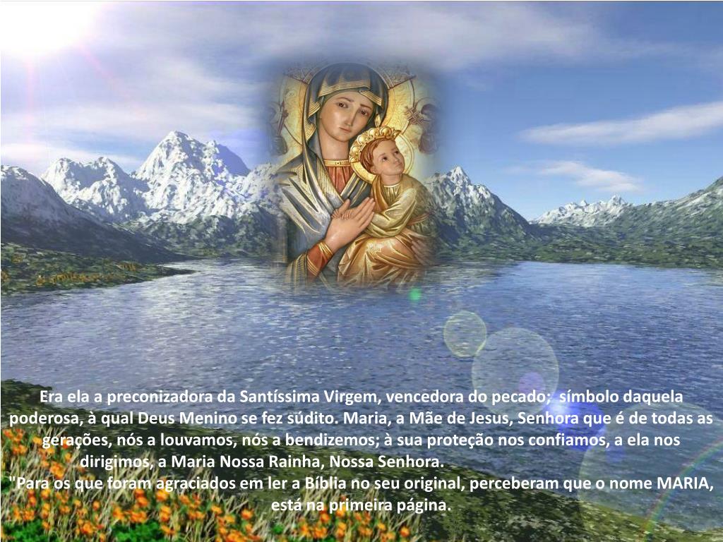 Era ela a preconizadora da Santíssima Virgem, vencedora do pecado; símbolo daquela poderosa, à qual Deus Menino se fez súdito. Maria, a Mãe de Jesus, Senhora que é de todas as gerações, nós a louvamos, nós a bendizemos; à sua proteção nos confiamos, a ela nos dirigimos, a Maria Nossa Rainha, Nossa Senhora. "Para os que foram agraciados em ler a Bíblia no seu original, perceberam que o nome MARIA, está na primeira página.