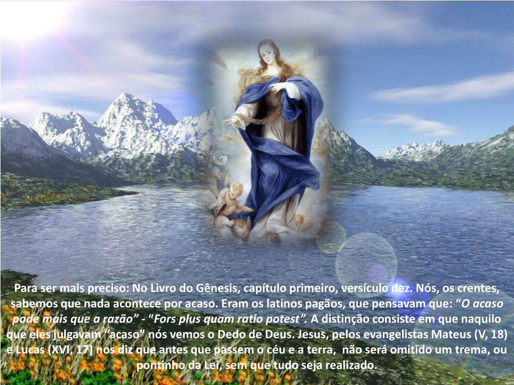Para ser mais preciso: No Livro do Gênesis, capítulo primeiro, versículo dez. Nós, os crentes, sabemos que nada acontece por acaso. Eram os latinos pagãos, que pensavam que: “O acaso pode mais que a razão” - “Forsplusquam ratio potest”. A distinção consiste em que naquilo que eles julgavam “acaso” nós vemos o Dedo de Deus. Jesus, pelos evangelistas Mateus (V, 18) e Lucas (XVI, 17) nos diz que antes que passem o céu e a terra, não será omitido um trema, ou pontinho da Lei, sem que tudo seja realizado.
