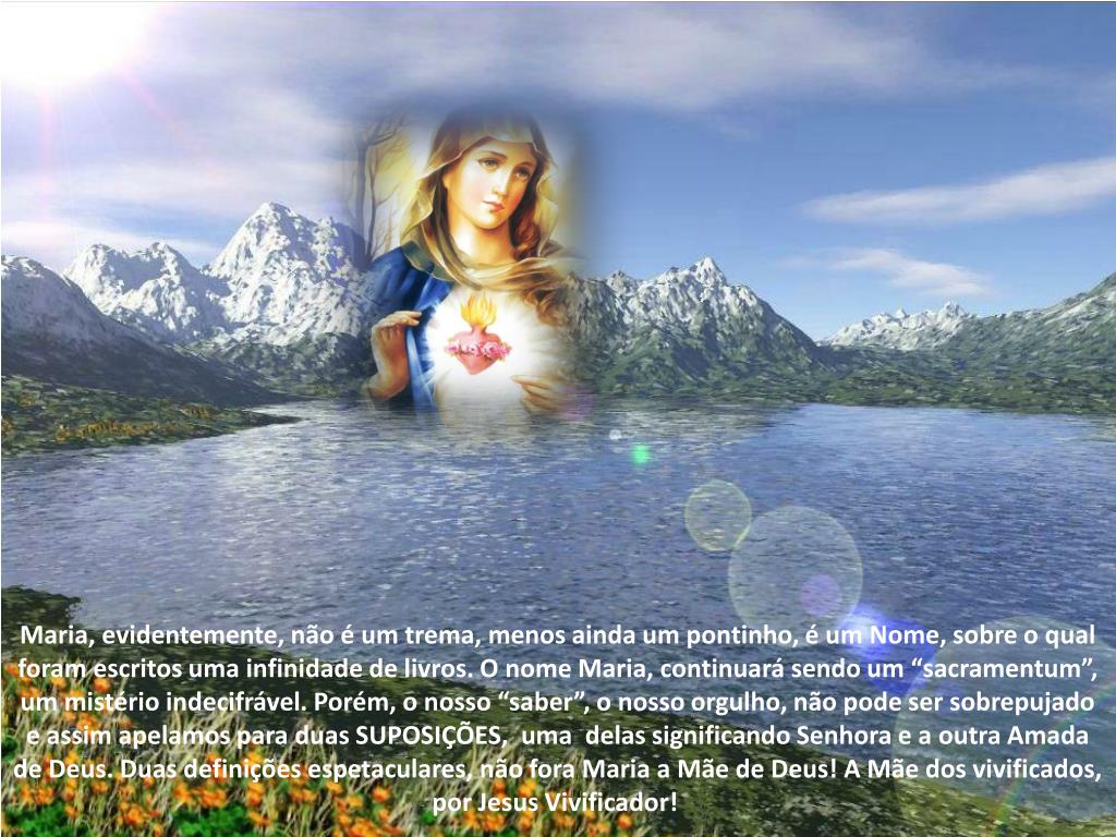 Maria, evidentemente, não é um trema, menos ainda um pontinho, é um Nome, sobre o qual foram escritos uma infinidade de livros. O nome Maria, continuará sendo um “sacramentum”, um mistério indecifrável. Porém, o nosso “saber”, o nosso orgulho, não pode ser sobrepujado e assim apelamos para duas SUPOSIÇÕES, uma delas significando Senhora e a outra Amada de Deus. Duas definições espetaculares, não fora Maria a Mãe de Deus! A Mãe dos vivificados, por Jesus Vivificador!
