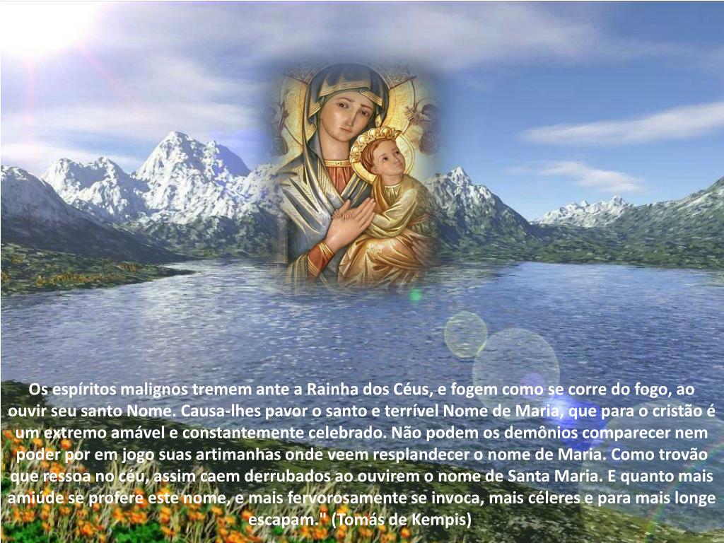 Os espíritos malignos tremem ante a Rainha dos Céus, e fogem como se corre do fogo, ao ouvir seu santo Nome. Causa-lhes pavor o santo e terrível Nome de Maria, que para o cristão é um extremo amável e constantemente celebrado. Não podem os demônios comparecer nem poder por em jogo suas artimanhas onde veem resplandecer o nome de Maria. Como trovão que ressoa no céu, assim caem derrubados ao ouvirem o nome de Santa Maria. E quanto mais amiúde se profere este nome, e mais fervorosamente se invoca, mais céleres e para mais longe escapam." (Tomás de Kempis)