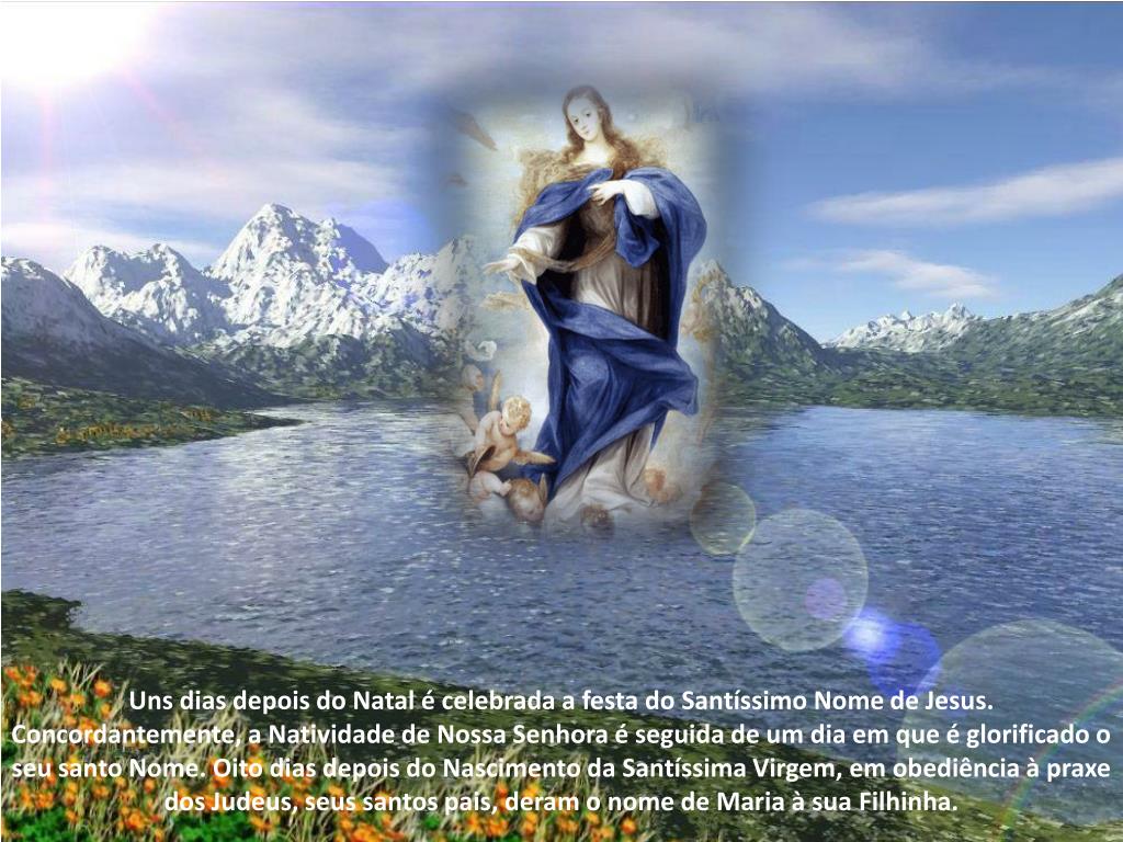 Uns dias depois do Natal é celebrada a festa do Santíssimo Nome de Jesus. Concordantemente, a Natividade de Nossa Senhora é seguida de um dia em que é glorificado o seu santo Nome. Oito dias depois do Nascimento da Santíssima Virgem, em obediência à praxe dos Judeus, seus santos pais, deram o nome de Maria à sua Filhinha.