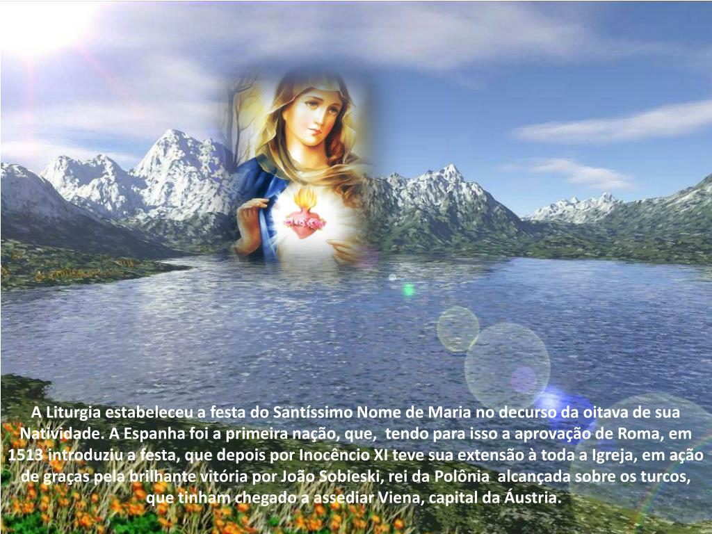 A Liturgia estabeleceu a festa do Santíssimo Nome de Maria no decurso da oitava de sua Natividade. A Espanha foi a primeira nação, que, tendo para isso a aprovação de Roma, em 1513 introduziu a festa, que depois por Inocêncio XI teve sua extensão à toda a Igreja, em ação de graças pela brilhante vitória por João Sobieski, rei da Polônia alcançada sobre os turcos, que tinham chegado a assediar Viena, capital da Áustria.