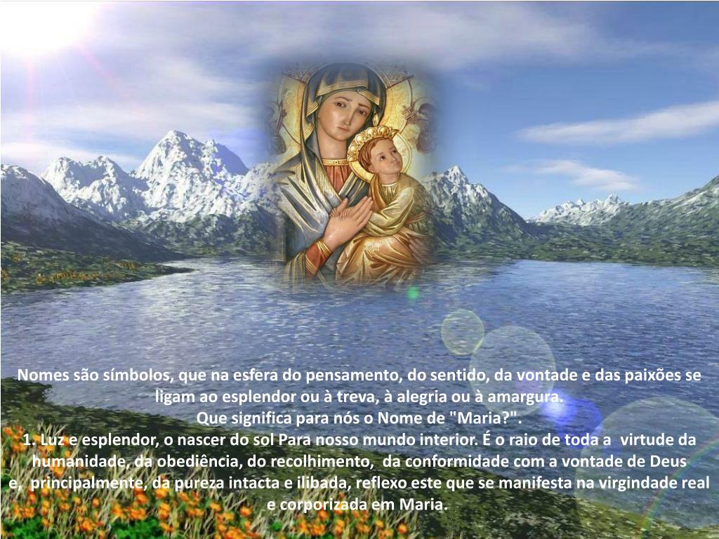 Nomes são símbolos, que na esfera do pensamento, do sentido, da vontade e das paixões se ligam ao esplendor ou à treva, à alegria ou à amargura. Que significa para nós o Nome de "Maria?". 1. Luz e esplendor, o nascer do sol Para nosso mundo interior. É o raio de toda a virtude da humanidade, da obediência, do recolhimento, da conformidade com a vontade de Deus e, principalmente, da pureza intacta e ilibada, reflexo este que se manifesta na virgindade real e corporizada em Maria.