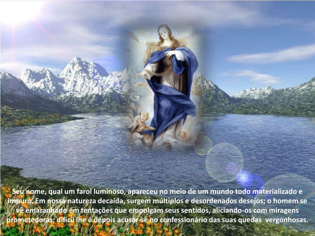 Seu nome, qual um farol luminoso, apareceu no meio de um mundo todo materializado e impuro. Em nossa natureza decaída, surgem múltiplos e desordenados desejos; o homem se vê emaranhado em tentações que empolgam seus sentidos, aliciando-os com miragens prometedoras; difícil lhe é depois acusar-se no confessionário das suas quedas vergonhosas.