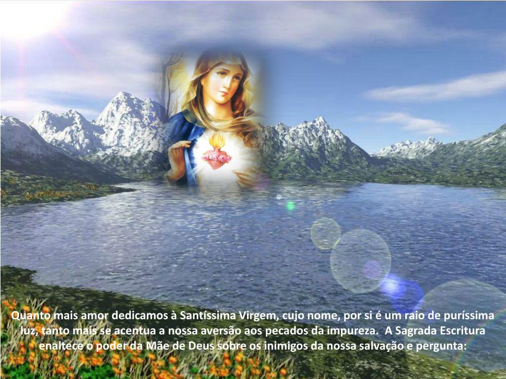 Quanto mais amor dedicamos à Santíssima Virgem, cujo nome, por si é um raio de puríssima luz, tanto mais se acentua a nossa aversão aos pecados da impureza. A Sagrada Escritura enaltece o poder da Mãe de Deus sobre os inimigos da nossa salvação e pergunta: