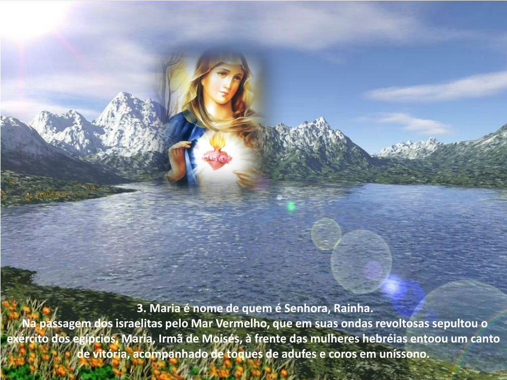 3. Maria é nome de quem é Senhora, Rainha. Na passagem dos israelitas pelo Mar Vermelho, que em suas ondas revoltosas sepultou o exército dos egípcios, Maria, Irmã de Moisés, à frente das mulheres hebréias entoou um canto de vitória, acompanhado de toques de adufes e coros em uníssono.