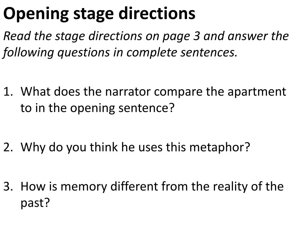 Opening stage directions Read the stage directions on page 3 and answer the following questions in complete sentences. • What does the narrator compare the apartment to in the opening sentence? • Why do you think he uses this metaphor? • How is memory different from the reality of the past?