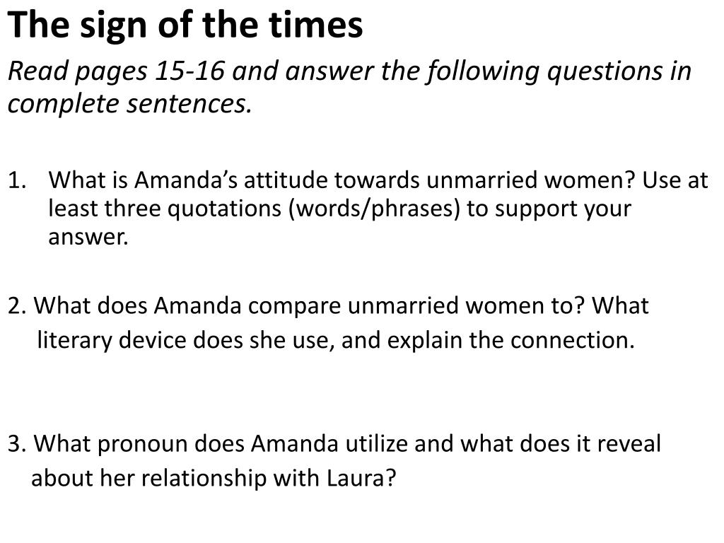 The sign of the times Read pages 15-16 and answer the following questions in complete sentences. • What is Amanda’s attitude towards unmarried women? Use at least three quotations (words/phrases) to support your answer. 2. What does Amanda compare unmarried women to? What literary device does she use, and explain the connection. 3. What pronoun does Amanda utilize and what does it reveal about her relationship with Laura?
