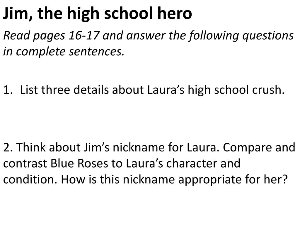 Jim, the high school hero Read pages 16-17 and answer the following questions in complete sentences. • List three details about Laura’s high school crush. 2. Think about Jim’s nickname for Laura. Compare and contrast Blue Roses to Laura’s character and condition. How is this nickname appropriate for her?