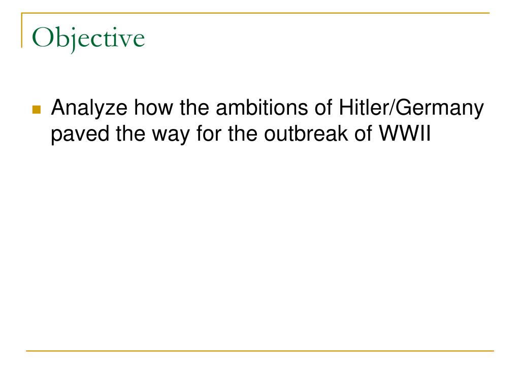 Objective • Analyze how the ambitions of Hitler/Germany paved the way for the outbreak of WWII