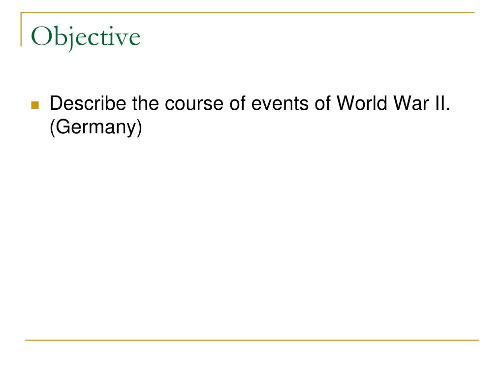 World War II: Germany. Objective. Analyze how the ambitions of Hitler/Germany paved the way for the outbreak of WWII. Germany’s Path to War. Hitler’s theory of racial domination laid the foundation for aggressive expansion of Germany Hitler starts by violating the Treaty of Versailles.