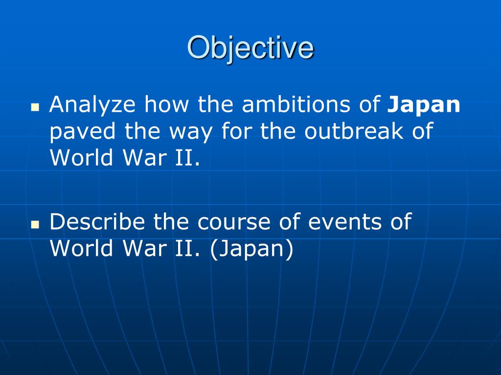 Objective Analyze how the ambitions of Japan paved the way for the outbreak of World War II. Describe the course of events of World War II. (Japan)