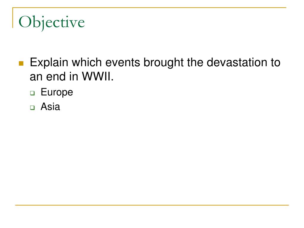 Objective • Explain which events brought the devastation to an end in WWII. • Europe • Asia