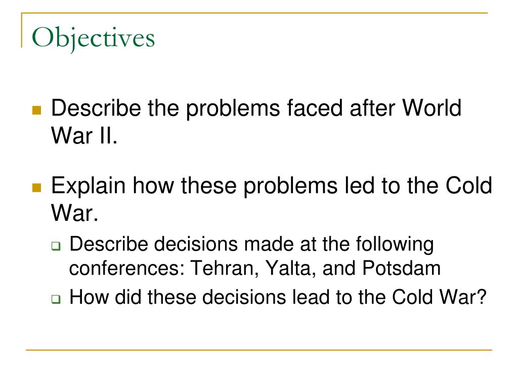 Objectives • Describe the problems faced after World War II. • Explain how these problems led to the Cold War. • Describe decisions made at the following conferences: Tehran, Yalta, and Potsdam • How did these decisions lead to the Cold War?
