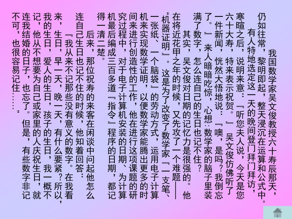 我国数学家吴文俊教授六十寿辰那天,仍如往常,黎明即起,整天浸沉在运算和公式中。 有人特地选定这一天的晚间登门拜门拜访,寒暄之后,说明来意:“听您夫人说,今天是您六十大寿,特来表示祝贺。” 吴文俊仿佛听了一件新闻,恍然大悟地说:“噢,是吗?我倒忘了。” 来人暗暗吃惊,心想:数学家的脑子里装满了数字,怎么连自己的生日也记不住? 其实,吴文俊对日期的记忆力是很强的。他在将近花甲之年的时候,又先攻了一个难题——“机器证明”。这是为了改变了数学家“一支笔、一张纸、一个脑袋”的劳动方式,运用电子计算机来实现数学证明,以便数学家能腾出更多的时间来进行创造性的工作,他在进行这项课题的研究过程中,对于电子计算机安装的日期、为计算机最后编成三百多道“指令”程序的日期,都记得一清二楚。 后来,那位祝寿的来客在闲谈中问起他怎么连自己生日也记不住的时候,他知着回答:“我从来不记那些没有意义的数字。在我看来,生日,早一天,晚一天,有什么要紧?所以,我的生日,爱人的生日,孩子的生日,我一概不记,他从不想要为自己或家里的人庆祝生日,就连我结婚的日子,也忘了。但是,有些数字非记不可,也很容易记住……”