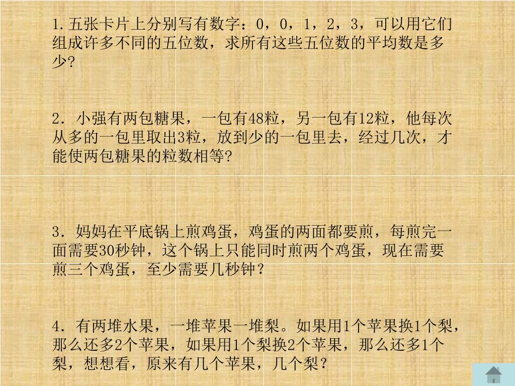 1.五张卡片上分别写有数字:0,0,1,2,3,可以用它们组成许多不同的五位数,求所有这些五位数的平均数是多少?1.五张卡片上分别写有数字:0,0,1,2,3,可以用它们组成许多不同的五位数,求所有这些五位数的平均数是多少? 2.小强有两包糖果,一包有48粒,另一包有12粒,他每次从多的一包里取出3粒,放到少的一包里去,经过几次,才能使两包糖果的粒数相等? 3.妈妈在平底锅上煎鸡蛋,鸡蛋的两面都要煎,每煎完一面需要30秒钟,这个锅上只能同时煎两个鸡蛋,现在需要煎三个鸡蛋,至少需要几秒钟? 4.有两堆水果,一堆苹果一堆梨。如果用1个苹果换1个梨,那么还多2个苹果,如果用1个梨换2个苹果,那么还多1个梨,想想看,原来有几个苹果,几个梨?