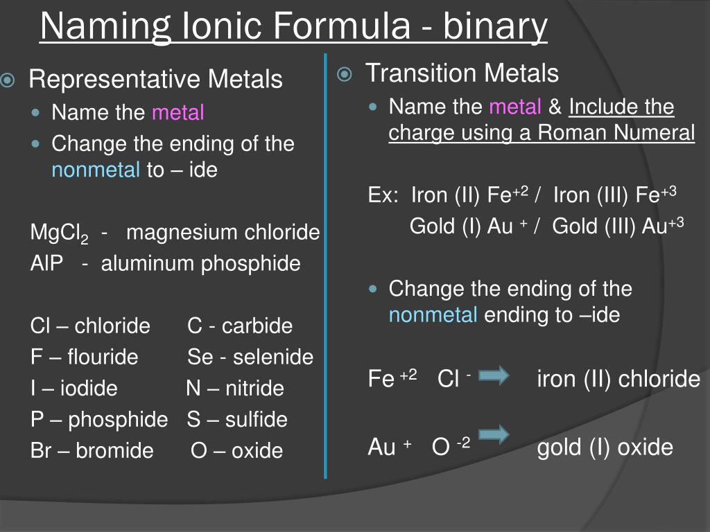 Naming ionic formulas - ternary Representative metal • Name the cation • Use the same name for the polyatomic ion • If the anion is a nonmetal – change the ending to -ide Transition metal • Name the metal and include a ROMAN NUMERAL for the charge of the metal • Use the same name for the polyatomic ion • If the anion is a nonmetal – change the ending to -ide